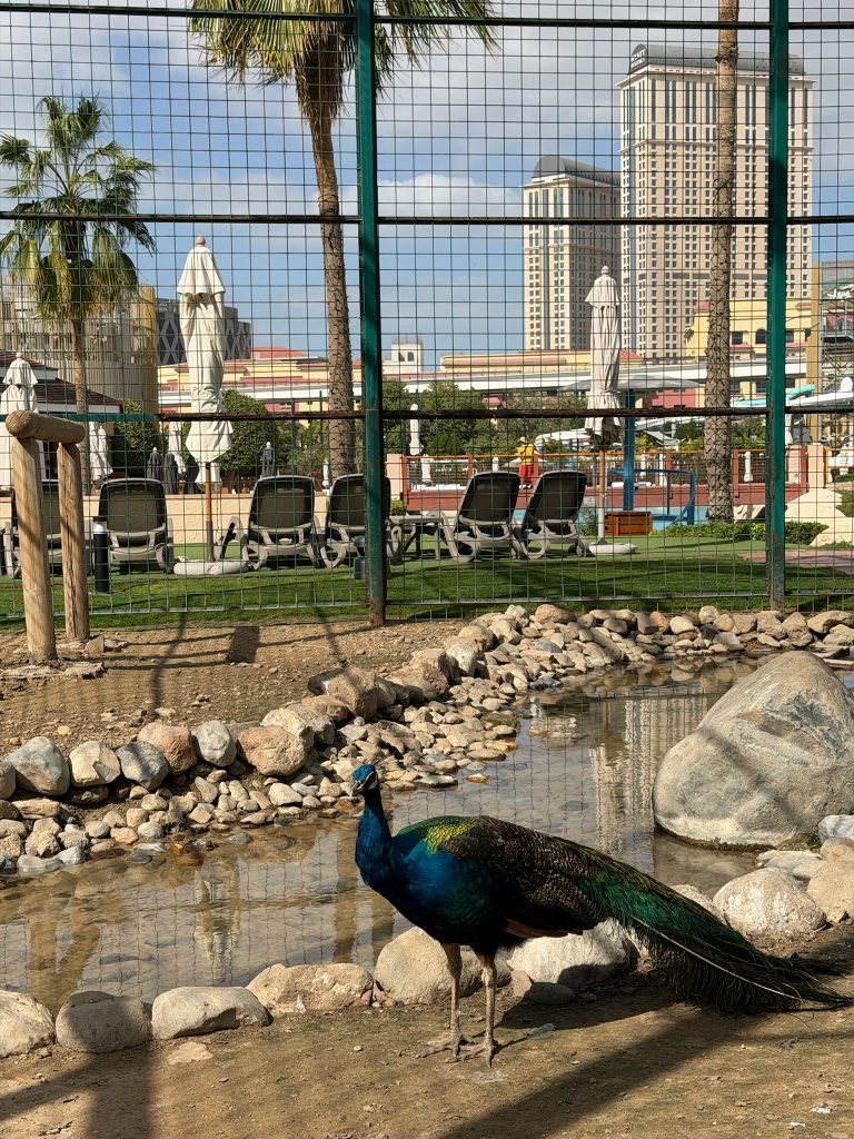 2003年に開業したこのホテルは、約15ヘクタールというドバイ屈指の広大な敷地を誇ります。中には孔雀がいるエリアもあります。 ロビーの下に行くと素晴らしい森が広がっているのですが、解説を見ると「マレーシアから全て森ごと持ってきた」とあります。砂漠のドバイでこれだけの緑を屋内に持ってきて、かつ船まであります。建築的にもとても面白い。維持するのは相当なコストがかかっているはず。ドバイらしい贅沢を肌で感じました。